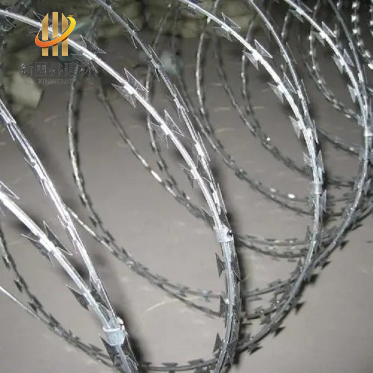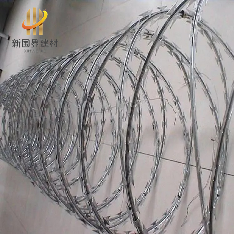 刀片刺丝,是一种发展起来的防护、隔离能力较强的新型防护网产品。锋利的刀型刺由双线扣装后成蛇腹状,具有美观、防阻效果好、施工便利等优点。刀片刺绳一般用于监狱监区做隔离和防护使用,因为刀片锋利不易触摸,可以起到一定的吓阻和防攀爬的作用。刀片刺绳,用途很广,可以用于居民的墙体防护,也可以用来圈地、生活小区围墙、私人住宅、别墅的围墙、门窗、高速公路、铁路护栏以及边境线等用来防护。
