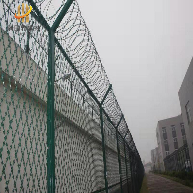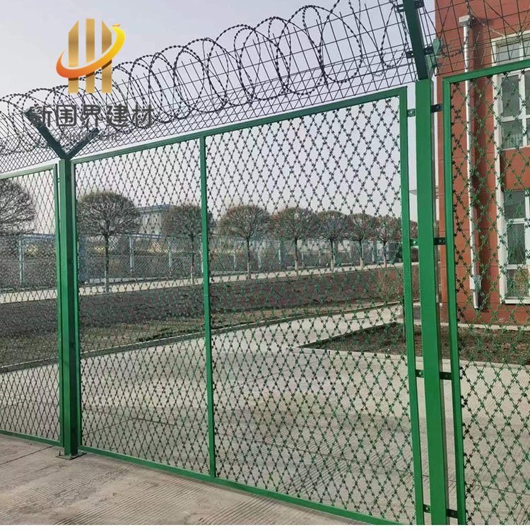 监狱内网,目前多采用焊接刀片网,或者叫刀片刺防攀爬网,这是一种由热镀锌或者不锈钢材制作的高安全隔离网。该产品是由刀片焊接网、立柱、顶部V型网、顶部蛇腹型刀刺网及连接配件组成。焊接刀刺网的网孔为50*100mm,75*150mm,表面可做喷塑处理。另外,监区隔离网也会采用358加密防护网或者梅花刺片隔离网等,这些都是常见的款式。都能达到隔离防护、防爬、抗剪切的效果。