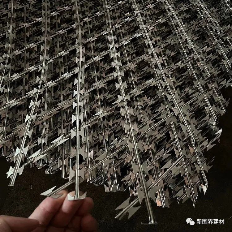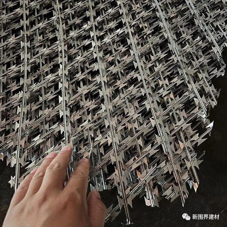 焊接刀片刺网是用直条的刀片刺绳直接焊接而成的网片,可以焊接成菱形孔或者方形孔,常见的网孔为50*100mm、75*150mm、100*100mm等。焊接成网片的刀片刺网拥有了小孔且不可攀爬的优点,同时在防护高度上改善了传统的螺旋形刀片刺绳,焊接成片不同的刺网尺寸,长度不限,支持定制加工。