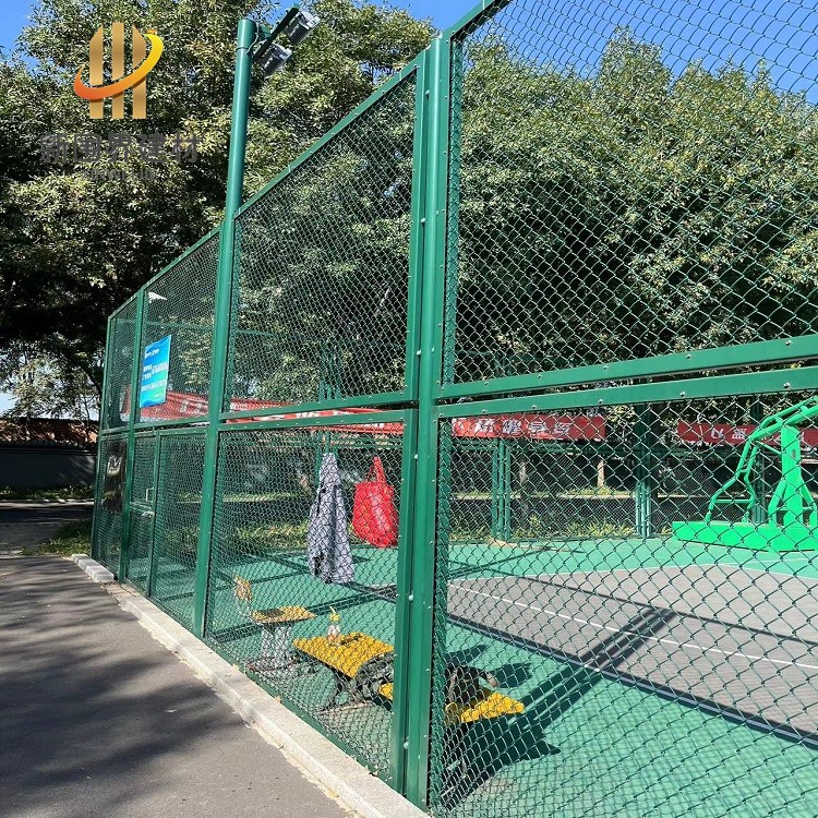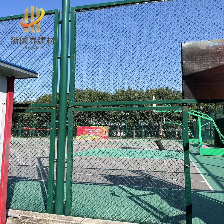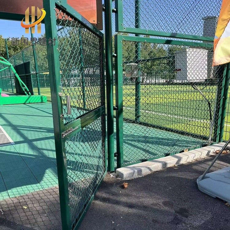 边框:圆管48或60mm,钢筋棍,立柱60或75mm圆管, 特点:安装方便,造价低,美观大方。 安装流程:先将勾花网展平,然后穿插入钢筋棍,将框架与立柱链接,然后再将勾花网网片与框架链接。 球场勾花网围网立柱结构:两边焊接边耳,框架两端焊接边耳,利用防盗螺丝固定边框和立柱的边耳即可。