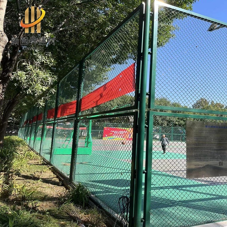 结构:横管:圆管48或60mm,钢筋棍,立柱60或75mm圆管(顶部与底部长出10cm左右来套接横管) 特点:安装方便,造价低,美观大方。 安装流程:先将勾花网展平,然后穿插入钢筋棍,勾花网网片与横管链接,横管穿插入立柱中。 套管组装体育场勾花网围网立柱的结构:立柱的上部和下部两端焊接出15cm左右的套管,用来插接横管,一般立柱是60mm圆管套接横管48mm,48圆管套接38mm圆管,75圆管套接60mm圆管。