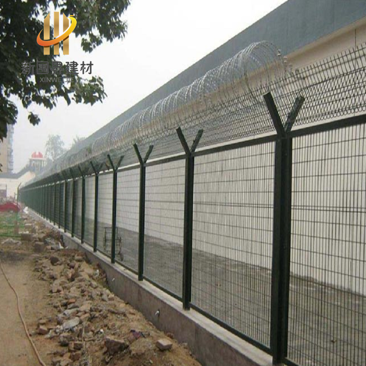 后是安装蛇腹式刀刺网,立柱顶部的V型直接两个侧臂焊接有专用的刺网勾,是每侧架设三道钢丝,形成一个V型槽,然后把刀刺网放到上面,再用配套卡扣把钢丝和刀刺网连接到一起,如果V型架内安装V型网架,安装就更简单了,直接把刀刺网连接到V型网上面就可以了,这样就完成了这个钢网墙的安装。