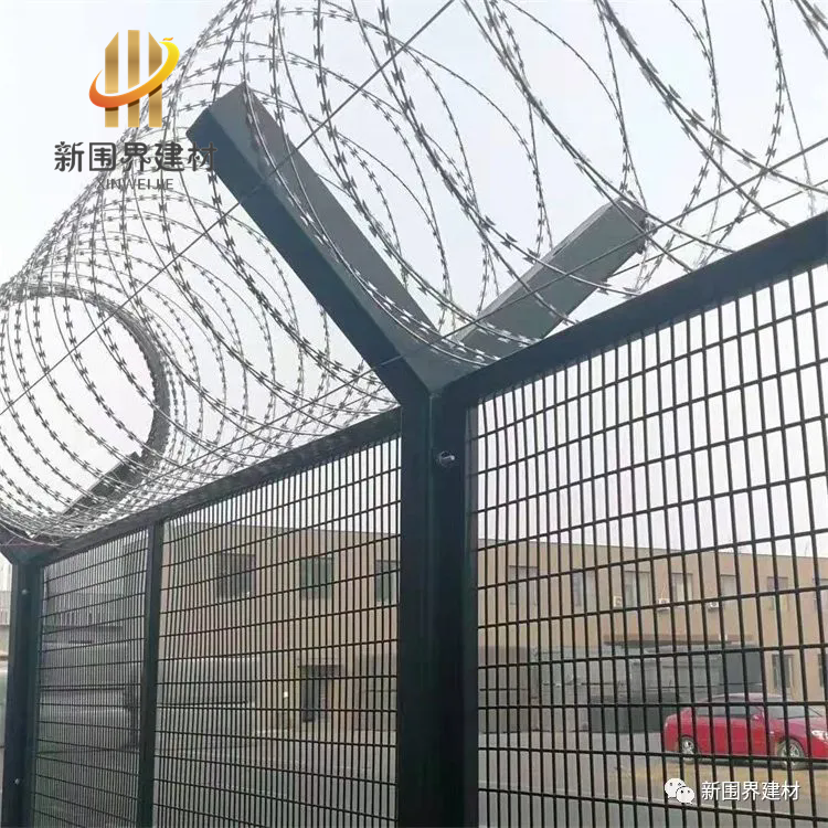 是由V型支架立柱,加强型焊接片网,安全防盗连接件和热镀锌刀片刺笼组成强度和安全防御性级别很高。近年来,被广泛应用在监狱、机场、边境线、基地等高安全场所。监狱隔离网安装方便,可直接在平地安装也可在围墙上二次安装,有效防止攀逃。