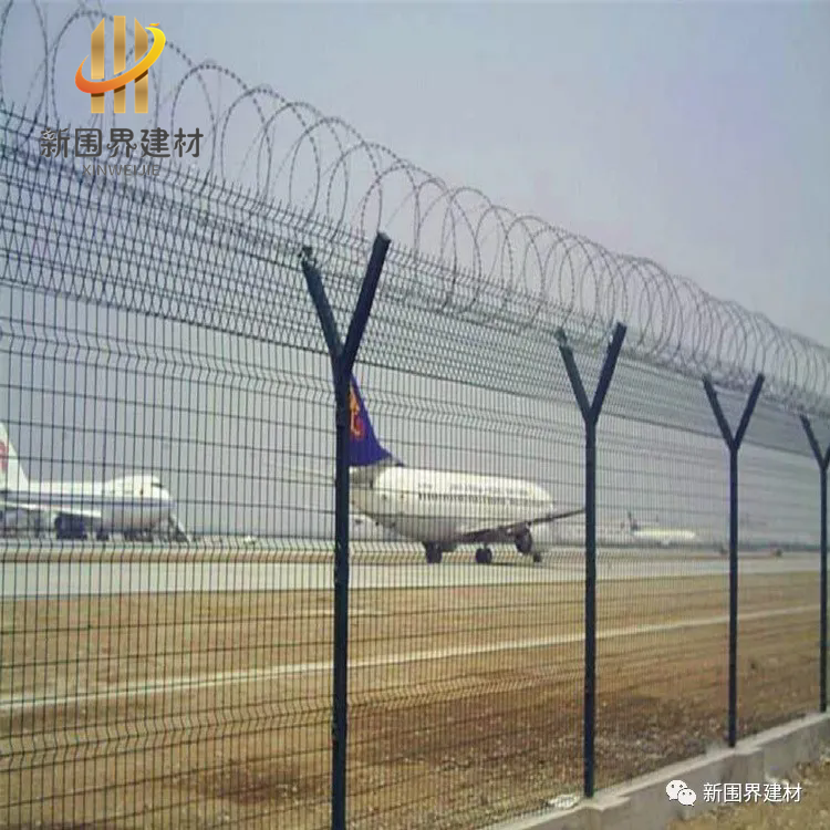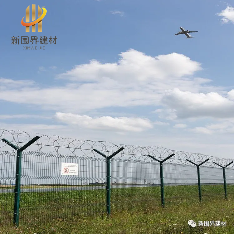 机场围栏由低碳钢丝焊接而成的网片、立柱、刺铁丝(可选)、斜撑(可选)连接而成。