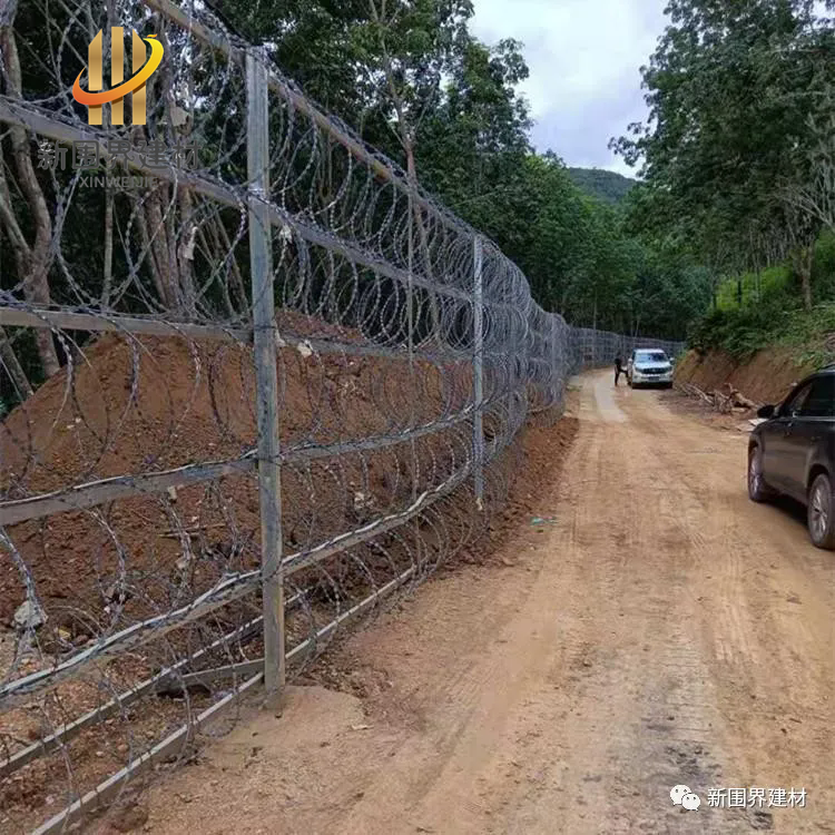 刀片刺绳防护网主要用于园林公寓、机关单位、哨所、边防等的圈禁防护。刀片刺绳防护网由锐利尖角镀锌钢板或不锈钢薄板做刀片,高张力钢丝做芯线组合而成的阻绝器材。由于刀片刺绳防护网造形独特不易触摸,因而能达到极好的防护隔离效果。