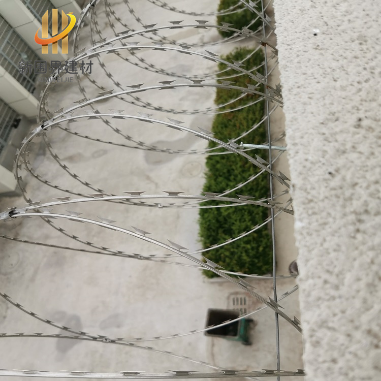 刀片刺网由热镀锌钢板或不锈钢薄板冲压出尖锐的刀片状,高张力镀锌钢丝或者不锈钢丝做芯线组合而成的阻绝器材。由于刺网造形独特不易触摸,因而能达到极好的防护隔离效果。产品的主要材质有镀锌板和不锈钢板。