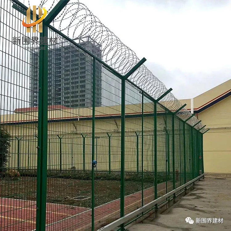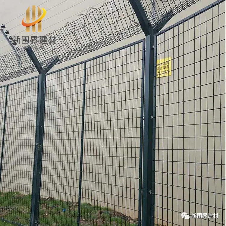机场Y型安全防御护网是由V型支架立柱,加强型焊接片网,安全防盗连接件和热镀锌刀片刺绳组成强度和安全防御性级别很高。近年来,被广泛应用在机场,军事基地等高安全场所。注:如果在机场护栏网顶部加装刀片刺丝、刀片刺绳后又很好的增强了安全防护性能。采用电镀、热镀、喷塑、浸塑等防腐形式,具有很好的防老化、防晒、防候等特点。其产品造型美观、花色多样,既起到围栏作用,又起到美化作用。由于具有安全性高、防攀爬能力好,网片连接方式采用特制SBS紧扣件,有效防止人为的破坏性拆卸,横向四道折弯加强筋,使网面强度显著增加。